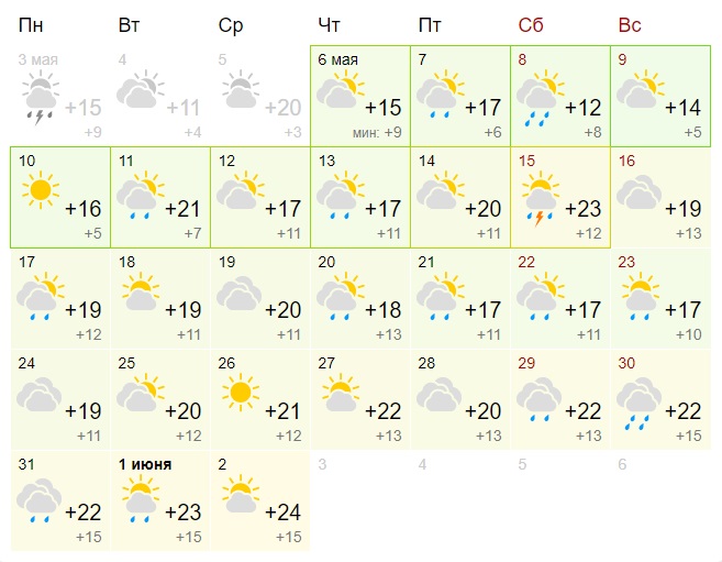 С 11 мая температура воздуха повысится - от 17 до 23 градусов тепла. 15 мая ожидается гроза, в остальные же дни - ливни и облачное небо. Пасмурную погоду прогнозируют до конца месяца. Лишь в среду, 26 мая, солнечные лучи будут греть Киев на протяжении всего дня.