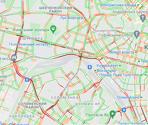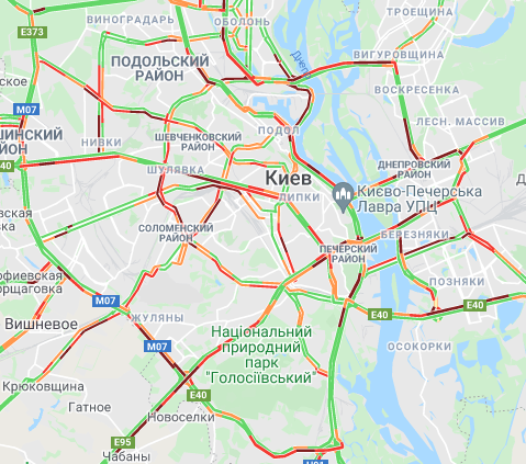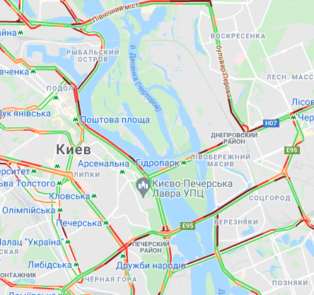 Также в заторах стоят проспект Николая Бажана, Броварской проспект, улица Братиславская, проспект Романа Шухевича, улица Набережно-Рыбальская, улица Набережно-Крещатицкая, проспект Героев Сталинграда, проспект Бандеры, проспект Победы, проспект Любомира Гузара и другие.