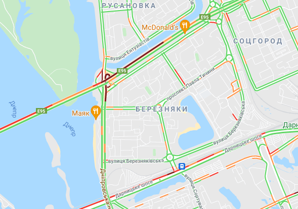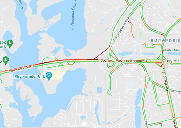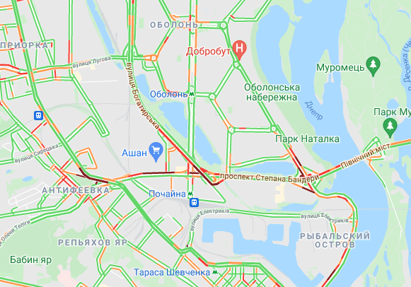 Пробки образовалась на проспекте Романа Шухевича и Северном мосту. "Тянучку" наблюдают на Русановском мосту, возле станций метро "Левобережная", "Черниговская" и "Лесная". Трудно проехать по Дарницкому шоссе и проспекту Соборности. Авто стоят в заторе по проспекту Николая Бажана, между станциями метро "Славутич" и "Осокорки". Наблюдаются пробки у станции метро "Бориспольская".