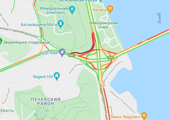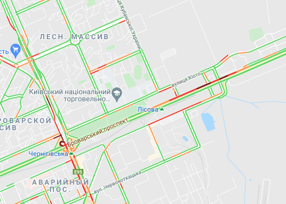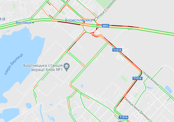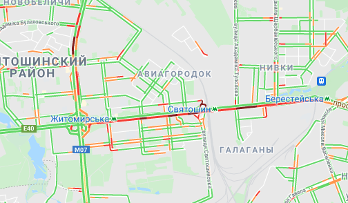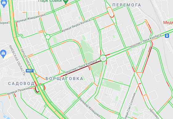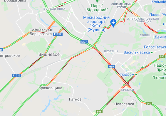 Пробки образовались по Кольцевой дороге. Автомобили стоят в заторах на улице Вадима Гетьмана и проспекте Леся Курбаса. Образовались пробки на проспекте Степана Бандеры, ул. Семена Скляренка, ул. Куреневская и ул. Елены Телиги. Трудно проехать по проспекту Валерия Лобановского, а также возле станций мертро "Берестейская", "Святошин" и "Академгородок".