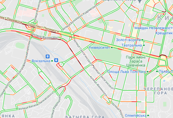 Авто стоят в небольших пробках на проспекте Победы. Трудно проехать по ул. Жилянская. Затруднено движение автомобилей по Набережно-Крещатицкой и Набережно-Рыбальской, а также на бульваре Дружбы народов.