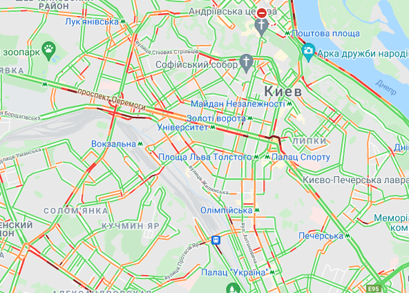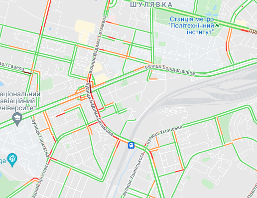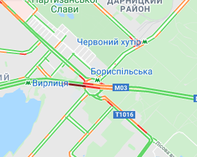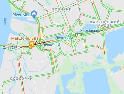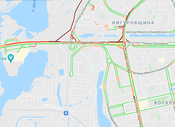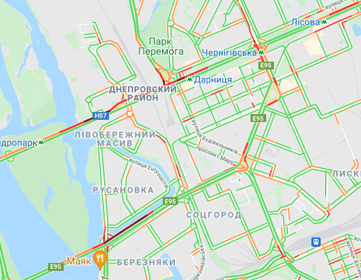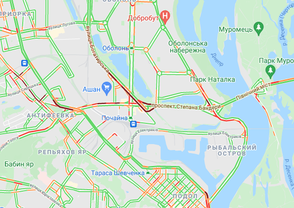 Затруднен проезд авто на проспекте Романа Шухевича, ул. Оноре де Бальзака и Северном мосту, где утром произошло ДТП, а также на Броварском проспекте (ближе к Русановскому мосту) и возле станции метро "Лесная". Трудно проехать возле рынка "Березняки" и по проспекту Николая Бажана, возле станций метро "Осокорки", "Славутич", а также возле станции метро "Вырлица".