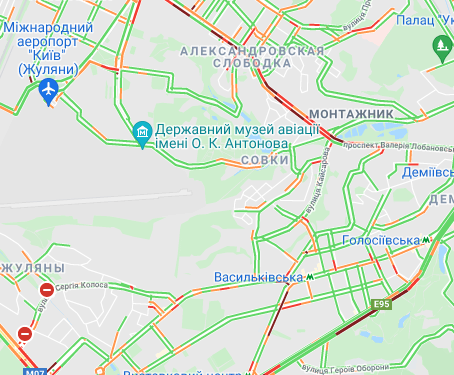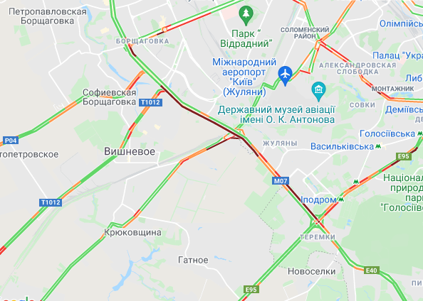 От станции метро "Теремки" по Кольцевой дороге стоит движение. Водитель находятся в пробке на улице Вадима Гетьмана и на проспекте Леся Курбаса. Образовались заторы на ул. Богатырская, ул. Семена Скляренко (возле Куреневского парка), ул. Сирецкая, ул. Кириловская и на проспекте Степана Бандеры. В большой "тянучке" стоят водители на бульваре Дружбы народов. Пробки наблюдают на проспектах Валерия Лобановского и Голосеевском.