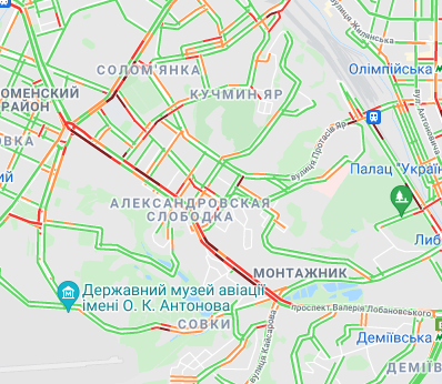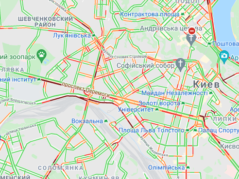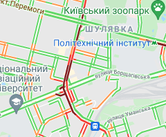 Авто стоят в пробках на проспекте Победы (от станции метро "Политехническая" до ул. Бульварно-Кудрявская). Трудно проехать по ул. Жилянская и ул. Борщаговская. Затруднено движение автомобилей на Парковой дороге, по Набережному шоссе, Набережно-Крещатицкой, на бульваре Дружбы народов и у станции метро "Выдубичи".