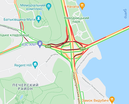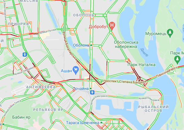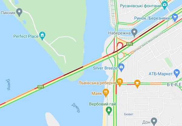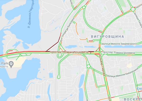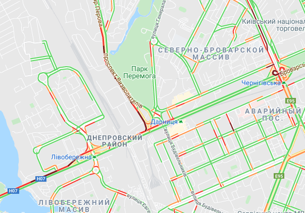 Трудно проехать по проспекту Романа Шухевича и ул. Оноре де Бальзака, образуются заторы на Северном мосту. Небольшие пробки наблюдаются у станций метро "Черниговская", "Дарница и "Левобережная", а также возле рынка "Березняки" и на мосту Патона. Авто стоят в пробке по проспекту Николая Бажана, между станциями метро "Осокорки" и "Славутич". Затор наблюдается возле станции метро "Бориспольская".