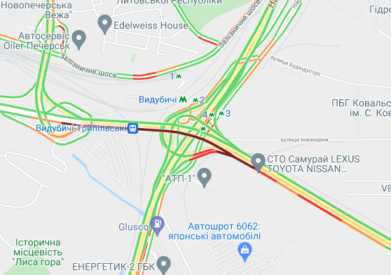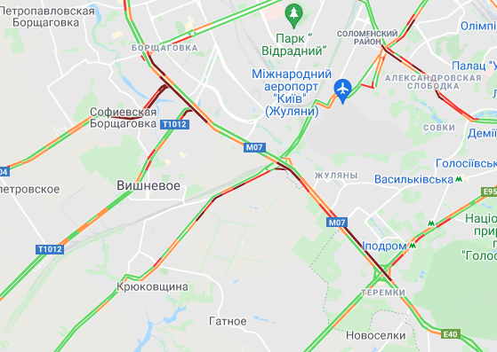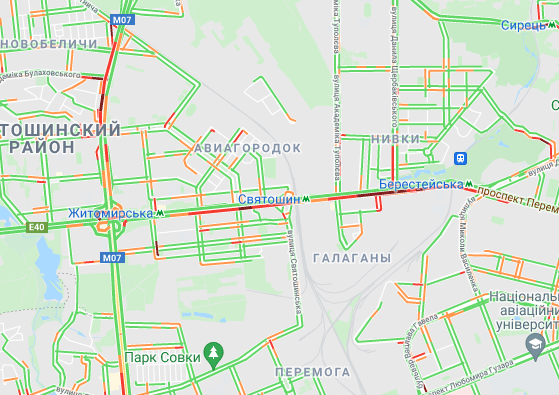 Пробки образовались по Кольцевой дороге. Автомобили стоят в заторах на улице Вадима Гетьмана, ул. Щусева, проспекте Валерия Лобановского (от Севастопольской площади до ул. Владимира Брожкj). Образовались пробки на проспекте Степана Бандеры, ул. Семена Скляренкj, ул. Богатырская, ул. Куреневская и возле парка "Наталка". Трудно проехать возле станций метро "Берестейская" и "Святошин".