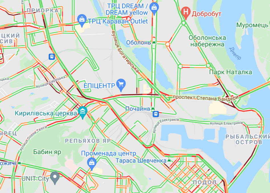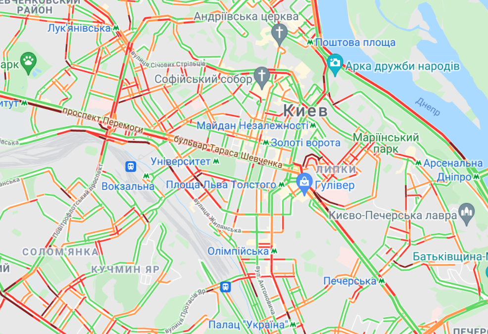 Трудно проехать метро "Кловская" по бульвару Леси Украинки, а также Бессарабскую площадь. Пробки традиционно образовались на проспекте Победы и ул. Жилянская. Небольшие заторы наблюдают на Набережно-Крещатицкой и Набережном шоссе.