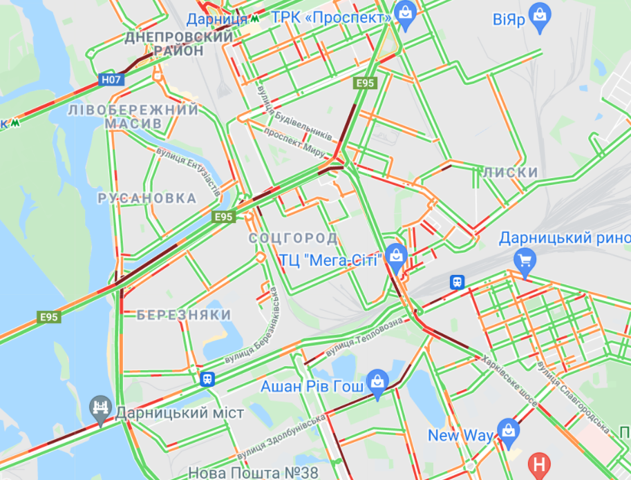 Затруднен проезд авто возле станций метро "Дарница, "Левобережная". Трудно проехать по проспекту Соборности (рынок "Березняки"), Дарницкому мосту и ул. Петра Радзина, а также по проспекту Николая Бажана.