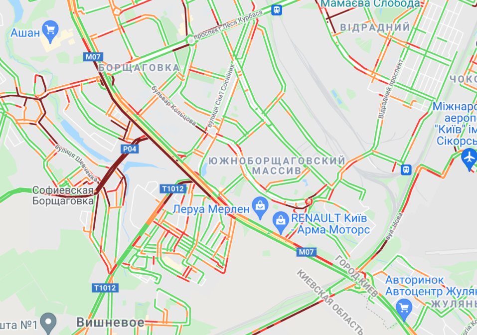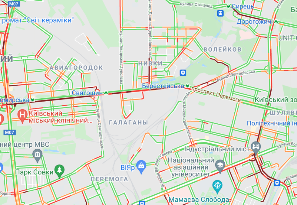 Большие пробки образовались на Софиевской Борщаговке и Кольцевой дороге. Пробки традиционно образовались на ул. Вадима Гетьмана и вблизи станций метро "Житомирская", "Святошин", "Берестейская" и "Сирец". Затруднено движение на Оболони (проспект Бандеры, проспект Героев Сталинграда, вблизи Куреневского парка и на Набережно-Рыбальской).