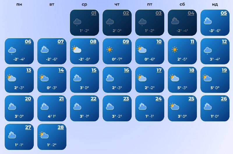 Вместе с этим, как предупреждают синоптики, до конца февраля в Киеве будут ночные морозы со средней температурой воздуха от -6 до -1 градуса.