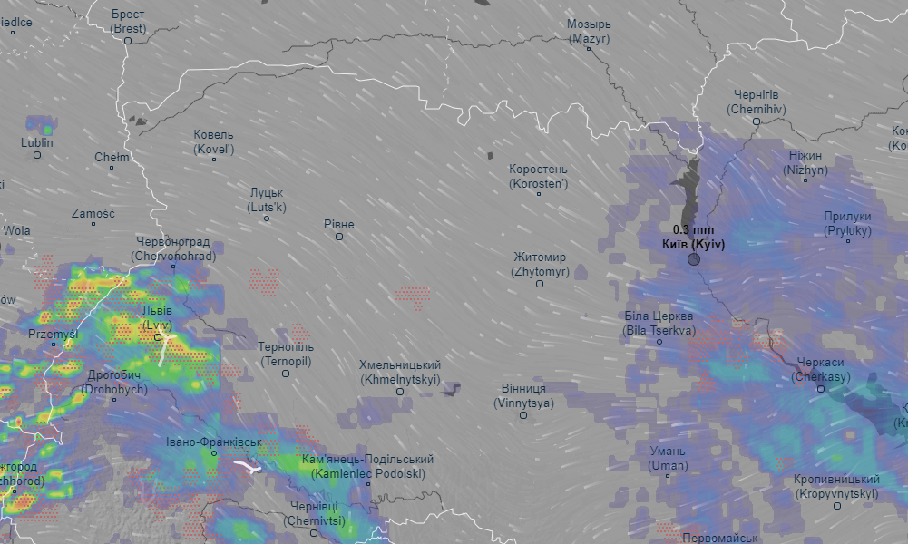 По данным погодного радара Ventusky, грозовой фронт движется на столицу с юго-востока. Сейчас под его влиянием находятся Черкасская, Киевская и Полтавская области.