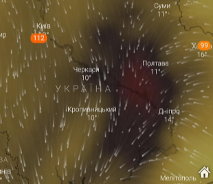 По его словам, это облако является результатом процесса накопления выбросов в атмосферу в Украине. На данный момент зона находится в районе Черкасс и Полтавы. В ближайшие дни красно-черное "пятно" дойдет и до территории Киева.