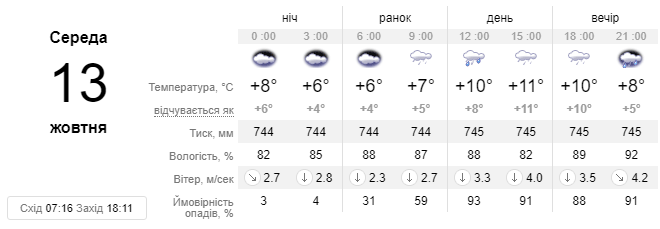 В среду, 13 октября, на протяжении всего дня будет стоять облачная погода. Мелкий дождь будет идти все время. Во второй половине дня он усилится и не успокоится до самого вечера.