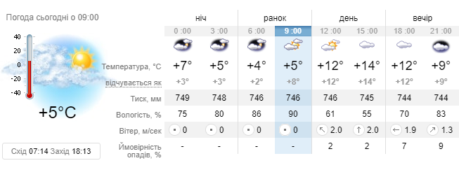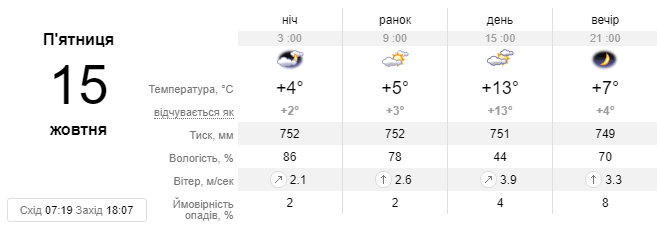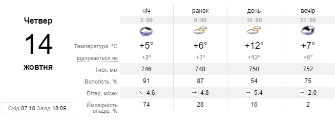 В четверг, 14 октября, в Киеве солнце в этот день будет редко показываться из-за облаков. Ночью возможен дождь, который к утру должен закончиться. Весь оставшийся день пройдет без осадков.