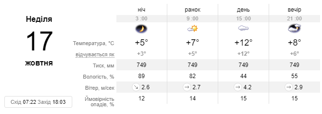 В воскресенье, 17 октября, ясное утреннее небо затянется облаками в середине дня и погода будет пасмурной до самого вечера. Без осадков.