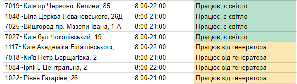 В списке представлены магазины, работающие от привычного электричества, а также генераторов. Кроме того, в перечне есть магазины, которые временно не работают из-за отсутствия питания.