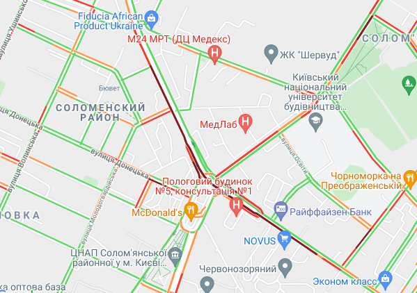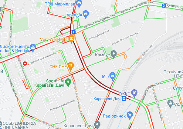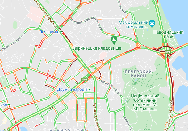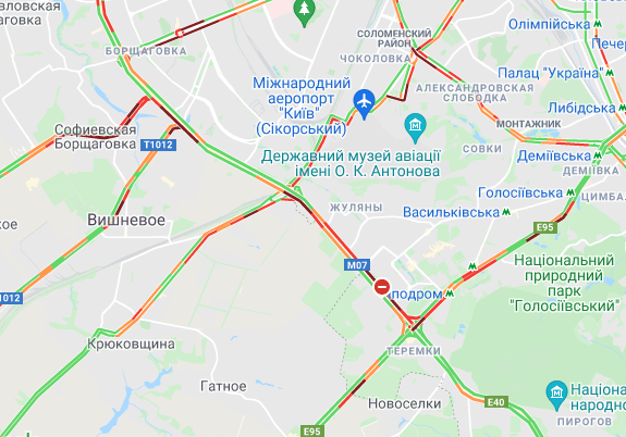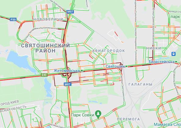 Пробки образовались по Кольцевой дороге. Автомобили стоят в заторах на улице Вадима Гетьмана, у Севастопольской площади, на проспектах Валерия Лобановского и Леся Курбаса. Образовались пробки на проспекте Степана Бандеры, ул. Семена Скляренка, ул. Вышгородская, ул. Кирилловская, ул. Героев Сталинграда, ул. Куреневская и ул. Елены Телиги. Трудно проехать возле станций метро "Берестейская", "Житомирская", "Святошин" и "Академгородок".