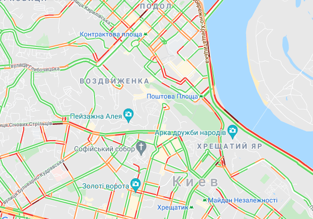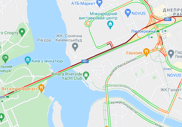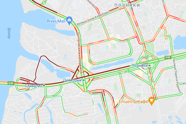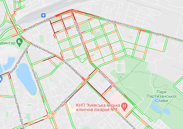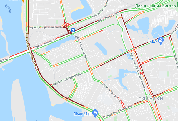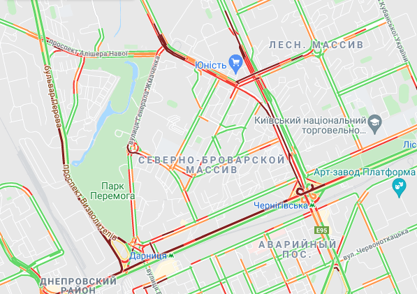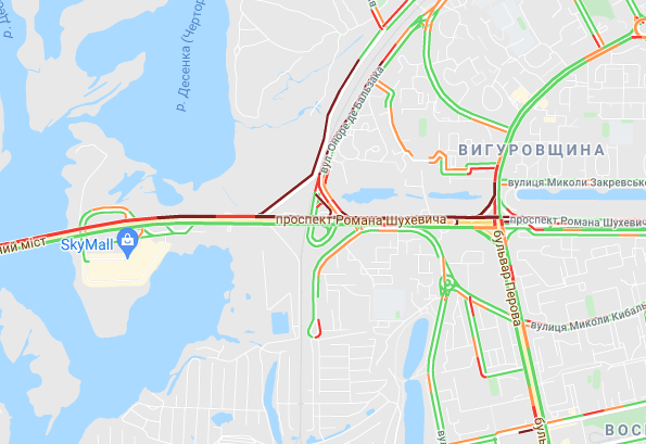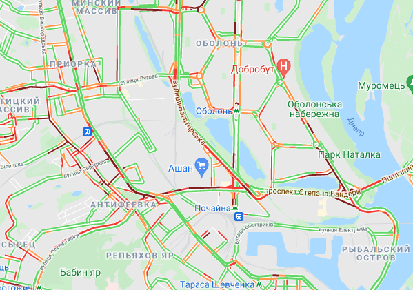 Пробки образовалась на Северном мосту, проспекте Романа Шухевича, бульваре Перова и ул. Оноре де Бальзака. "Тянучки" наблюдаются на подъездах к Русановском мосту, возле станций метро "Левобережная", "Черниговская" и "Дарница". Большой затор образовался возле рынка "Юность". Трудно проехать по Дарницкому шоссе и проспекту Соборности, а также попасть на мост Патона. Авто стоят в заторах по проспекту Николая Бажана, между станциями метро "Славутич" и "Осокорки", на подъездах к Южному мосту.