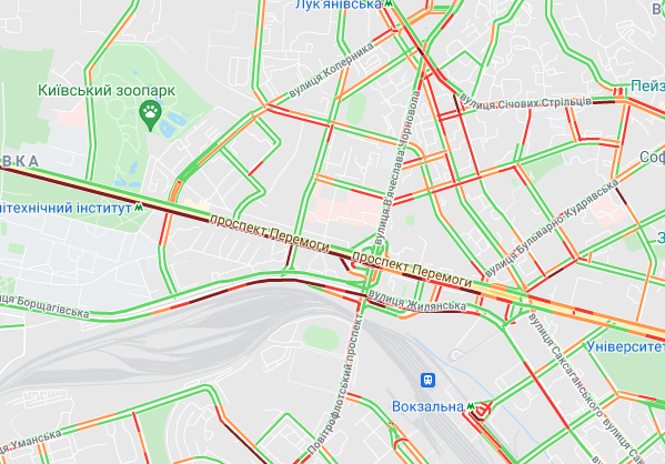 Авто стоят в больших пробках на проспекте Победы. Трудно проехать по ул. Жилянская. Пробки наблюдаются у станций метро "Вокзальная" и "Печерская". Затруднено движение автомобилей по Набережно-Крещатицкой, а также на бульваре Дружбы народов.
