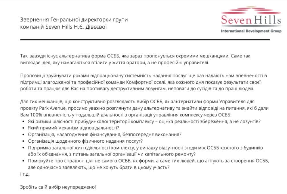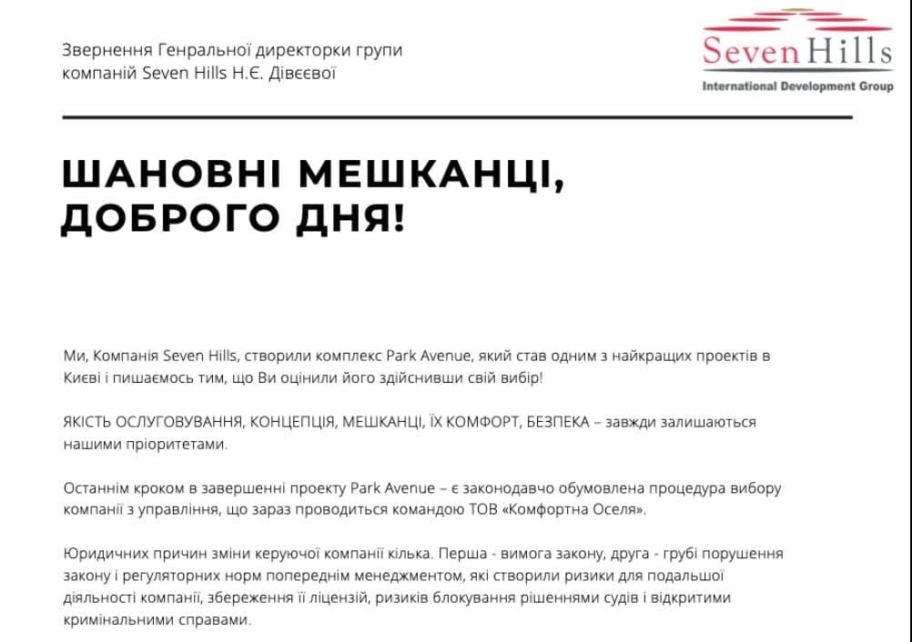 В свою очередь, ООО "Комфортна оселя" обнародовала обращение гендиректорки группы Seven Hills Натальи Дивеевой, где объясняются юридические причины изменения управляющей компании: "первое - требование закона, второе - грубые нарушения закона и регулятивных норм предыдущим менеджментом, которые создали риски для дальнейшей деятельности компании и ее лицензий".