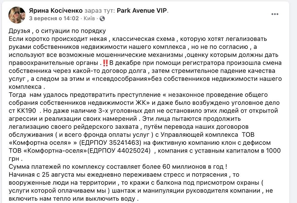 3 сентября экс-депутатка КГС Ирина Косиченко заявила о якобы попытке рейдерского захвата жилого комплекса.