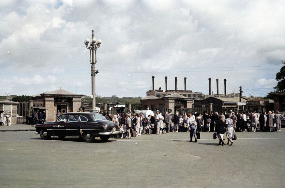 Тогдашняя очередь на такси на еще не застроенной Вокзальной площади. Люди готовы отстоять в очереди, чтобы удобно добраться до желаемого места встречи.