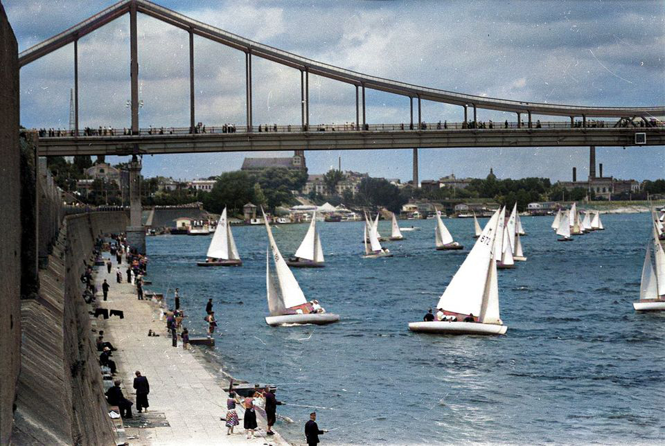 Пешеходный мост к пляжам Труханова острова. В 1960-е годы под мостом также активно сидели рыбаки.