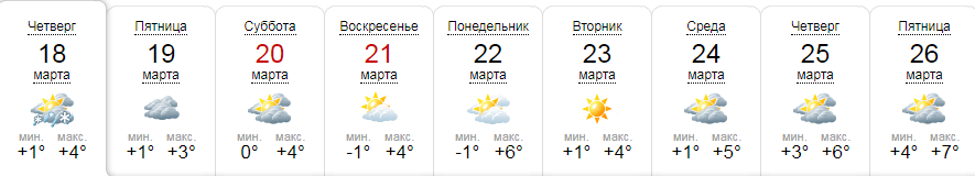 С 24 по 26 марта ожидается облачная погода, но без осадков. В пятницу, 26 марта, ожидается до 7 градусов тепла.