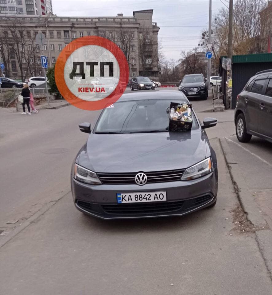 В Киеве на Нивках, на проспекте Победы, водителю, припарковавшему свой автомобиль с нарушением правил, на капот поставили ящик с мусором.