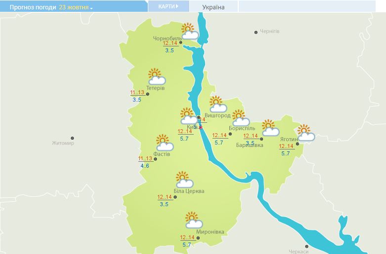 Синоптики не прогнозируют осадки на субботу, а температура днем в Киеве составит +12..+14 градусов. В среднем по области ночью столбики термометров опустятся до +3..+7 градусов.