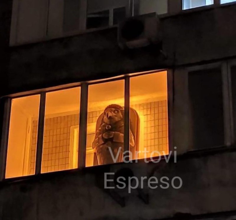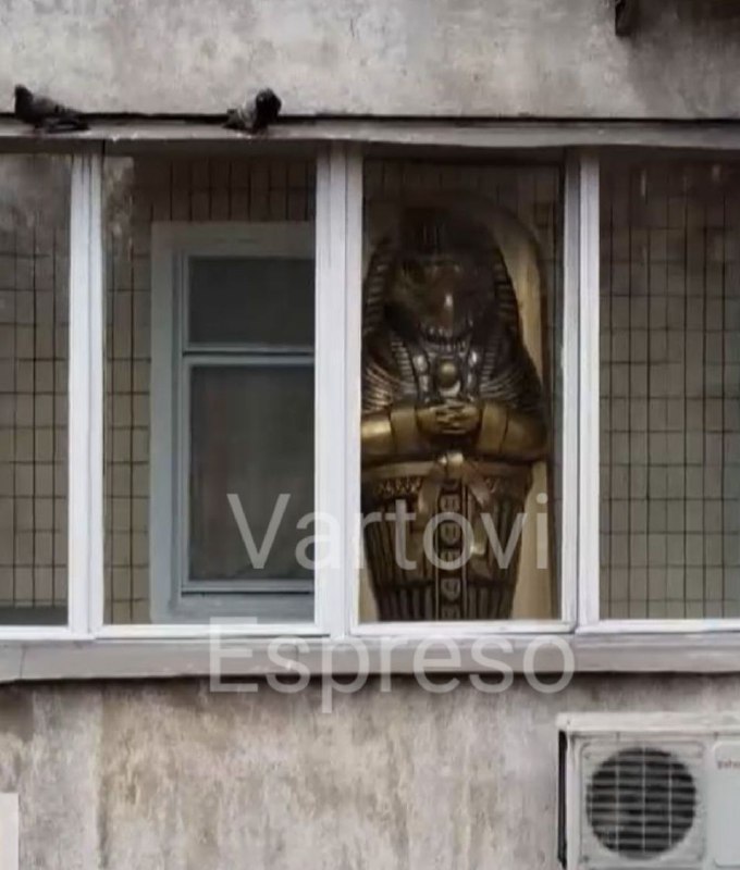 Прохожий Дмитрий опубликовал в сети фото египетского саркофага, который подперли об стену на балконе "лицом" к улице. Конструкция напоминает древнеегипетского бога Гора. Соседи видят "божество" каждое утро.