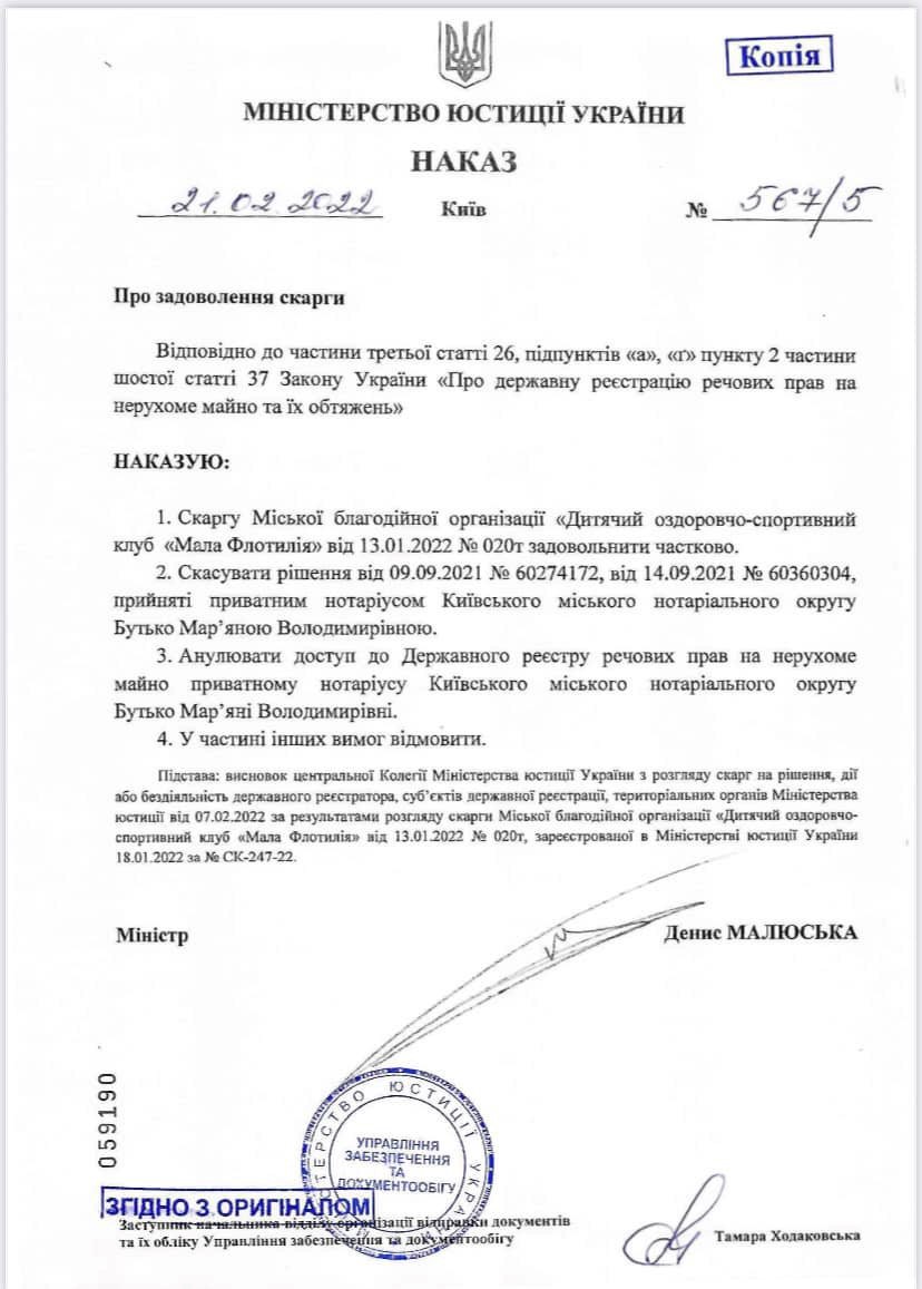 "Апостроф" провел расследование по Марьяне Бутько и установил, что 7 сентября 2021 она провела черную регистрацию по смене владельца здания №28 на Парковой дороге в Киеве (Труханов остров). Это 42 сооружения водно-спортивной базы, где киевляне занимались плотиной на Днепре. За такие грубые нарушения министр юстиции Денис Малюська навсегда аннулировал доступ Марьяне Бутько к Реестру недвижимости.