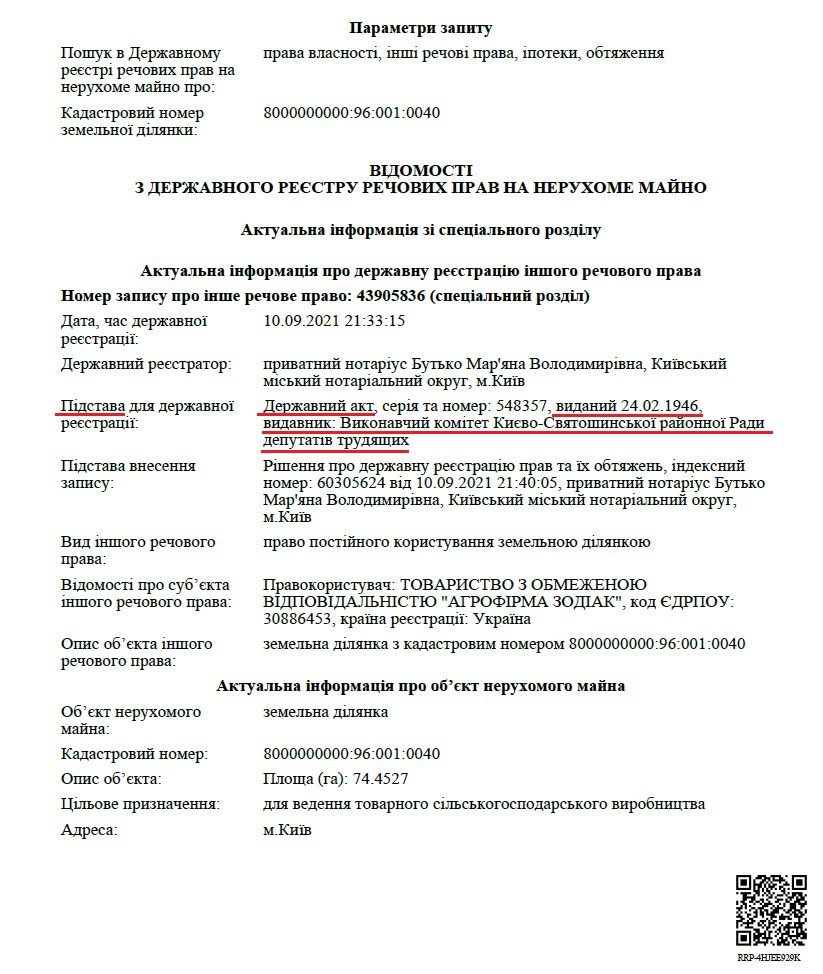 10 сентября 2021 скандально известная нотариус Киевского городского нотариального округа Марьяна Бутько зарегистрировала за ООО "Агрофирма "Зодиак" право постоянного пользования земельным участком на Осокорках площадью 74,4 га с целевым назначением "для ведения товарного сельскохозяйственного производства" (0 96:001:0040). Соответствующие сведения были внесены в Государственный реестр прав на недвижимое имущество.