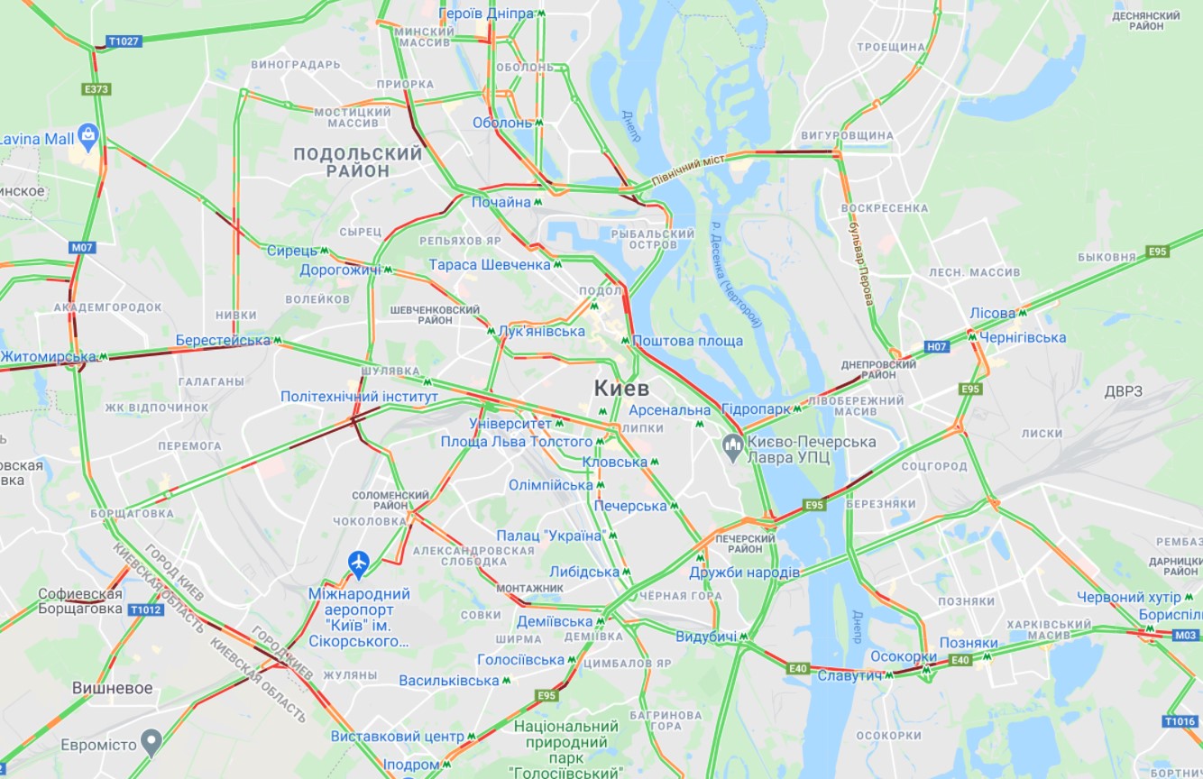 Движение затруднено на въездах в город, на мостах через Днепр и главных дорогах столицы.