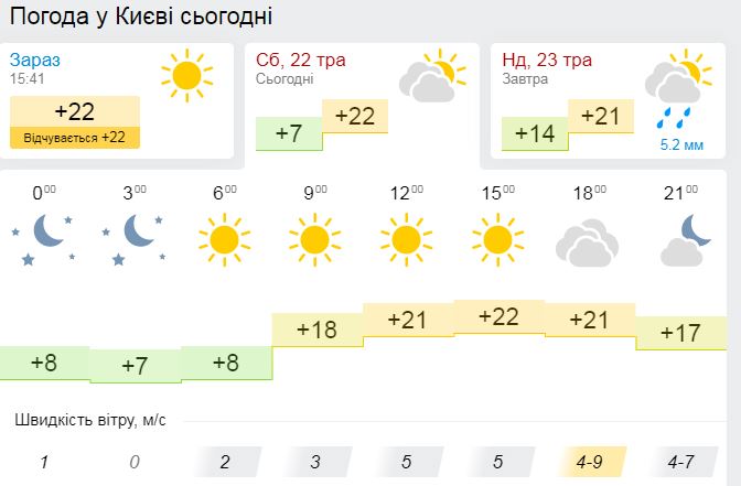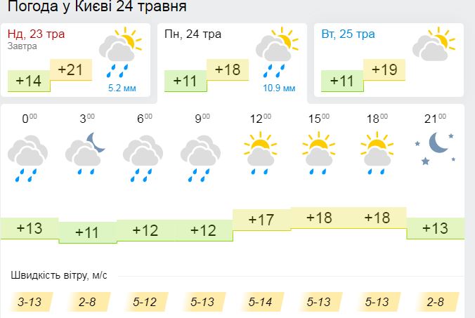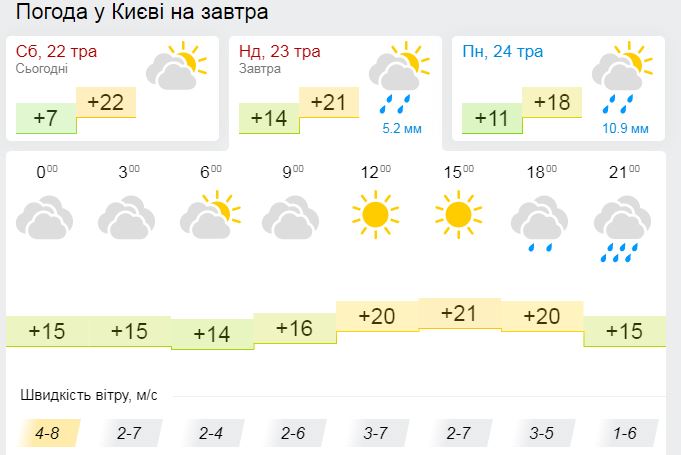Уже завтра, 23 дня, в Киев зайдет похолодание с дождями. До обеда ожидается теплая погода до +21, а к 18:00 синоптики прогнозируют осадки, которые задержатся в столице, как минимум, до понедельника, 24 мая.
