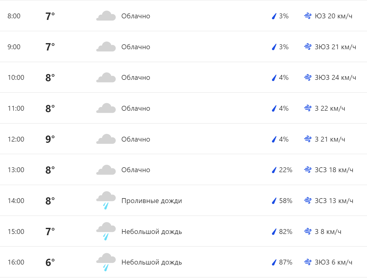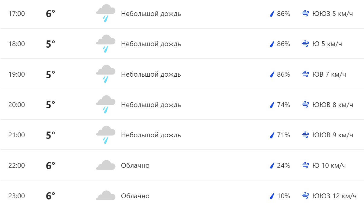 Утром в Киеве будет облачно, однако средняя температура воздуха достигнет 9°C уже к полудню. По данным метеостанции, после 13:00 киевляне будут наблюдать дождь, который лишь усилится к вечеру. Пиковые осадки ожидаются в период с 15:00 по 19:00. Жителей столицы также предупреждают о сильных порывах утром и днем.