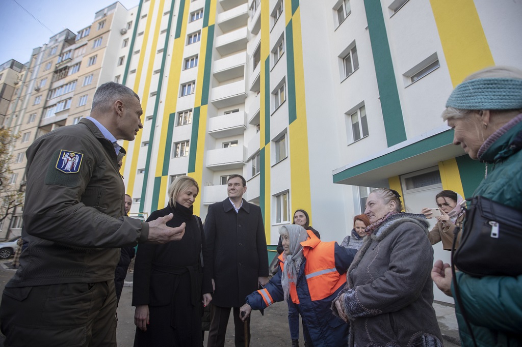 Он посетил пятиэтажное здание на проспекте Свободы в Подольском районе, который пострадал в марте этого года, когда снаряд разорвался в 4 метрах от его стены. По словам Кличко, на сегодня на объекте практически завершили строительные работы: фасад полностью отремонтирован и утеплен, восстановлены внутренние инженерные сети, почти завершен ремонт квартир и мест общего пользования, которые получили повреждения.