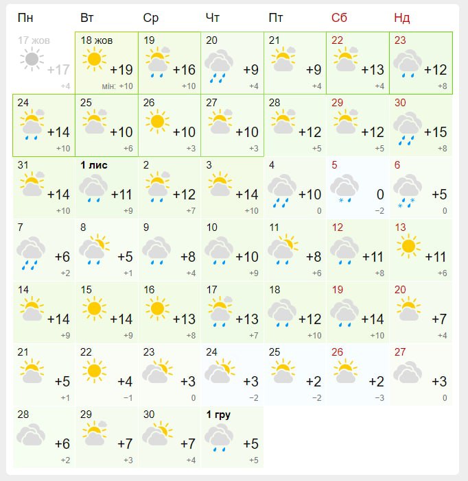Вскоре в Украине закончится бабье лето и вернется дождливая осенняя погода с порывистым ветром и возможным мокрым снегом. В частности, в Киеве в конце октября и начале ноября ожидаются ежедневные осадки.