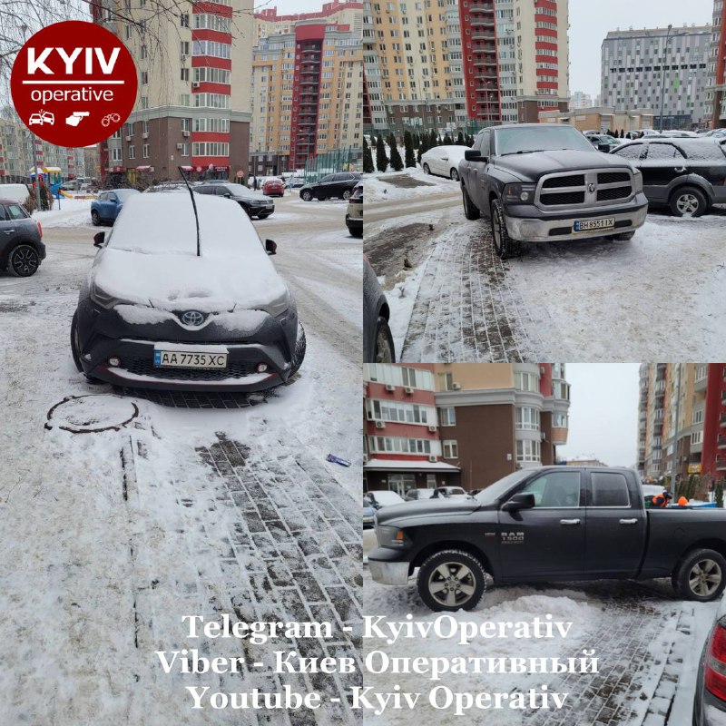 По словам киевлян, в ЖК Ликоград водители регулярно паркуются в пешеходной зоне. Так, на этот раз правила парковки нарушили автомобили Dodge и Toyota.