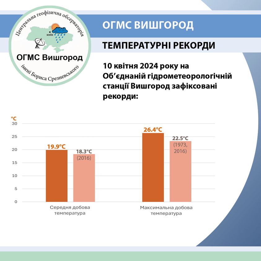Кроме этого, специалисты отмечают, что 10 апреля 2024 года Объединенная гидрометеорологическая станция Вышгород также зафиксировала новые рекорды. Среди них следующие: