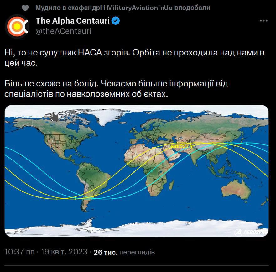 В то же время, образовательный проект о космосе The Alpha Centauri пишет, что над Киевом сгорел не американский спутник, а болид.