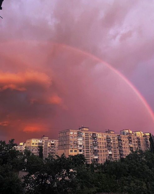 Вечер в Киеве в магическую дату 8.08.2023 года превратился в настоящее сказочное место. На кадрах видны одновременно две разноцветные дуги.