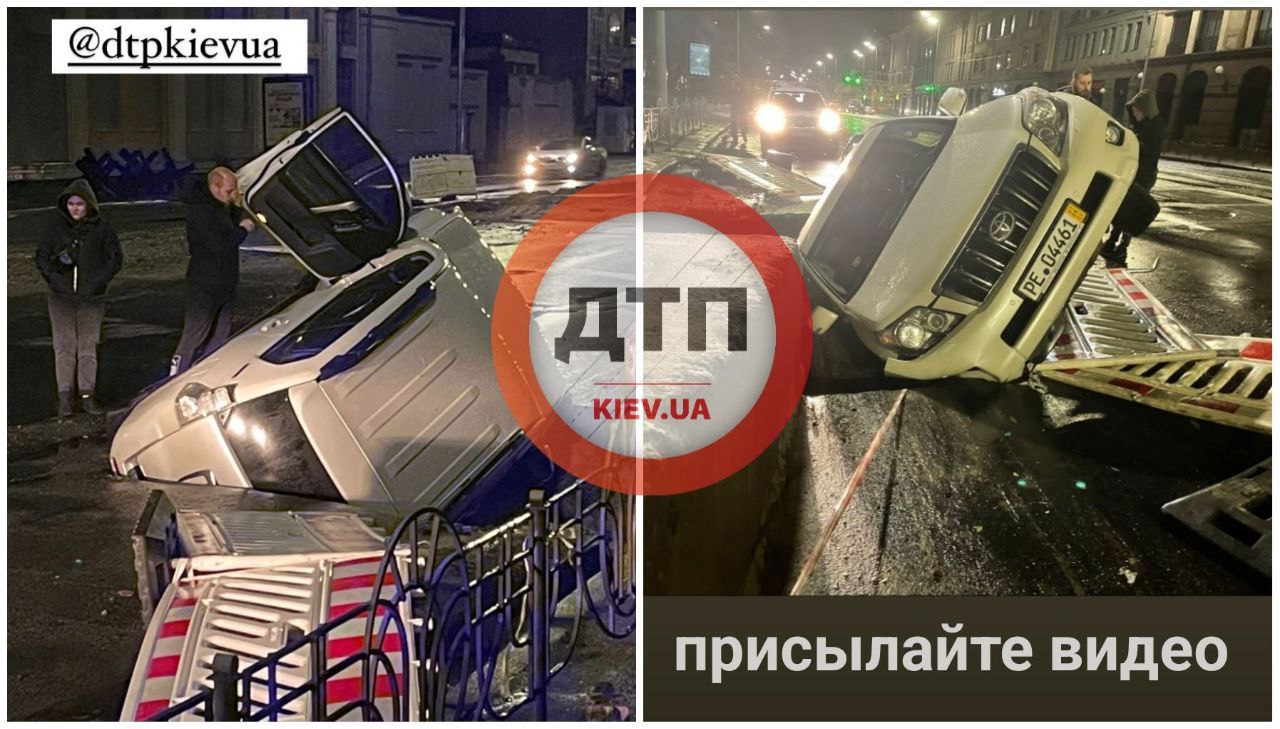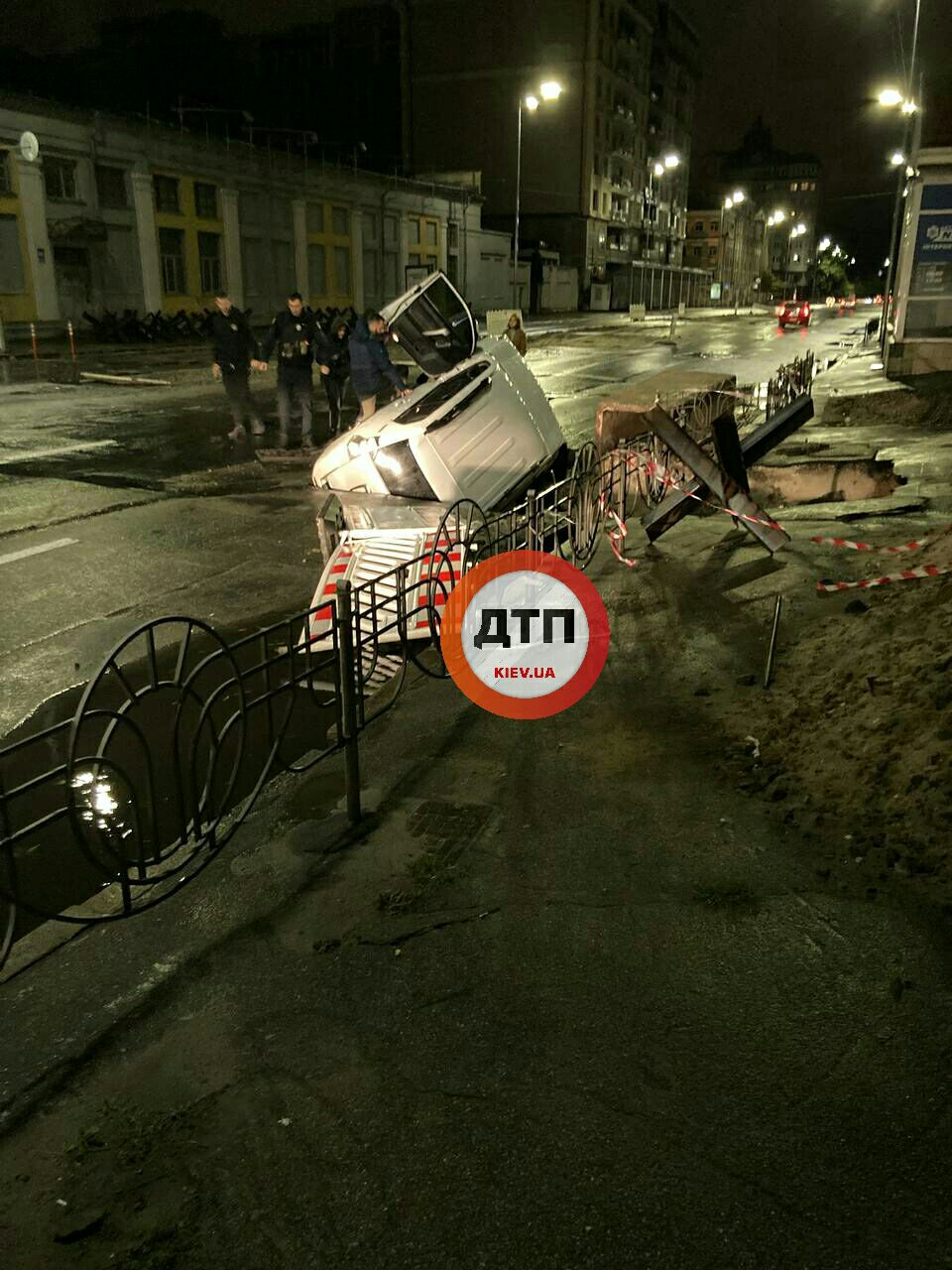 На улице Набережно-Луговой на Подоле Toyota Land Cruiser Prado застрял в асфальте – половина внедорожника оказалась под землей. Автомобиль перевернулся на бок, и его заднюю часть больше всего погрузило под асфальт.