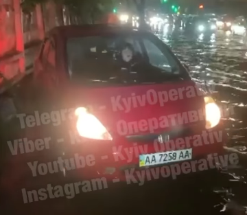 В центре Киева женщина за рулем авто пыталась объехать пробку по тротуару во время вчерашней грозы. Она "бодалась" с велосипедистом, который преградил ей путь.