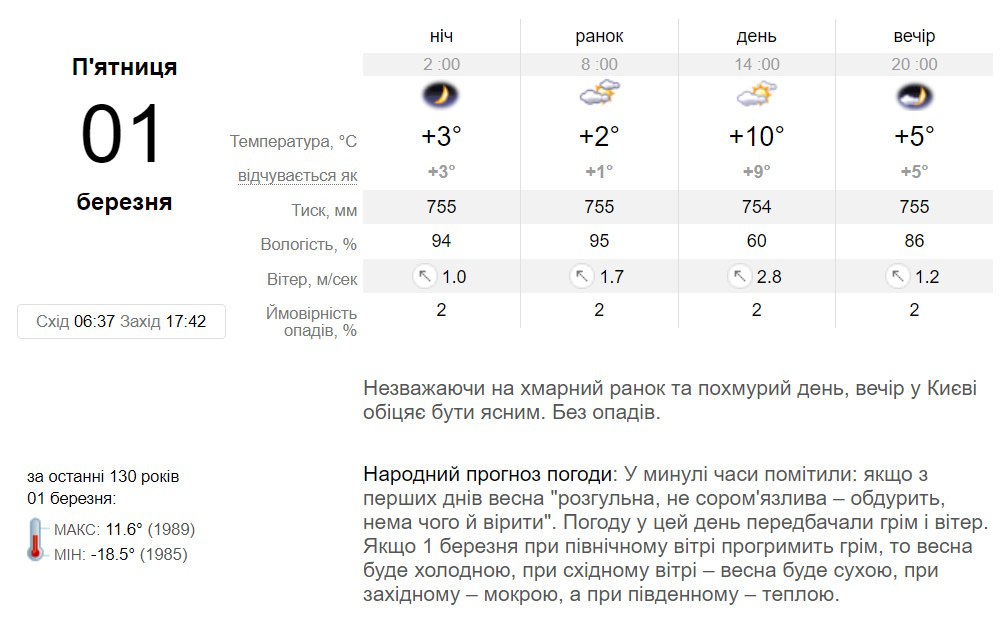 В пятницу, 1 марта, в Киеве облачная погода ожидается утром и днем, а к вечеру небо прояснится. Без осадков. Температура воздуха от +2 градуса ночью, до +10 градусов днем.