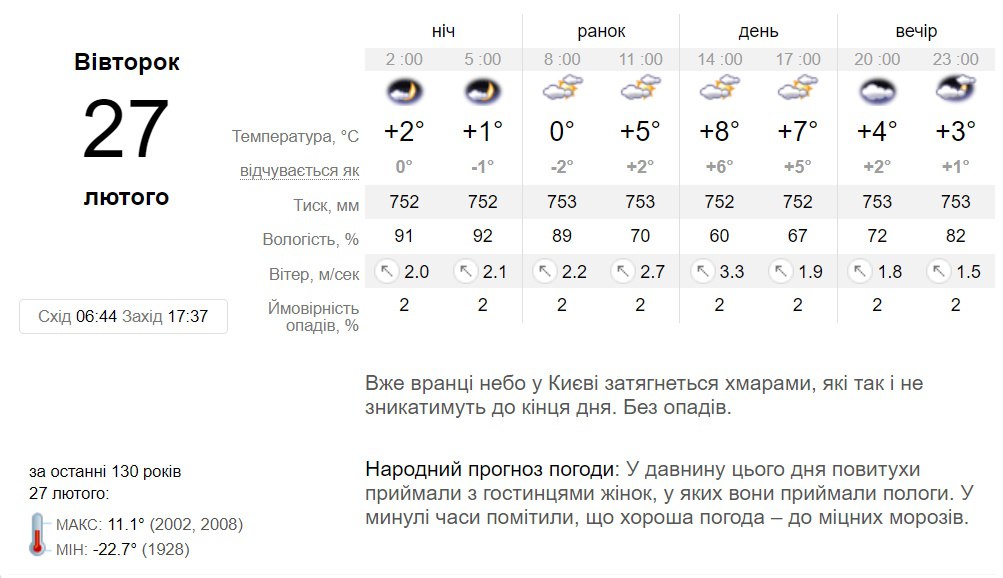 Во вторник, 27 февраля, облаков на небе не будет только ночью, а с утра до самого вечера в Киеве будет сохраняться пасмурная погода. Без осадков. Температура воздуха от 0 градусов ночью, до +9 градусов днем.