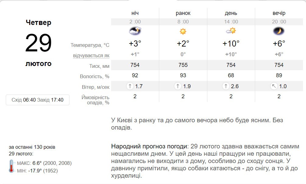 В четверг, 29 февраля, небо в Киеве будет покрыто облаками только ночью, утром оно очистится и будет ясным до самого вечера. Без осадков. Температура воздуха от +3 градусов ночью, до +10 градусов днем.