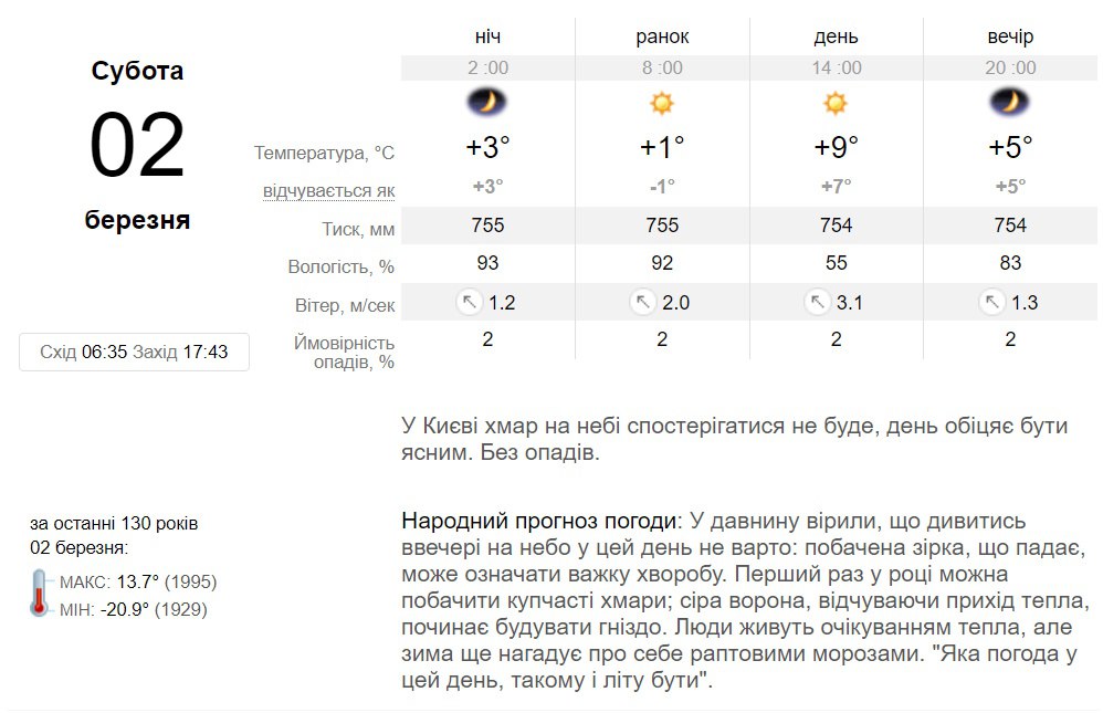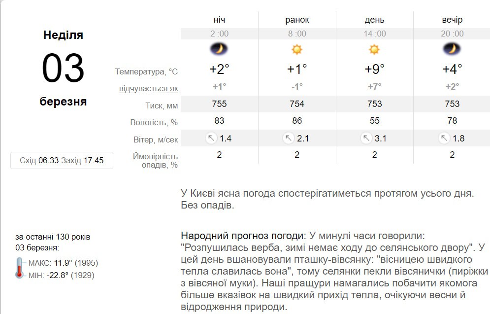В воскресенье, 3 марта, в Киеве тучи на небе наблюдаться не будет, день обещает быть ясным. Без осадков. Температура воздуха от +1 градуса ночью, до +9 градусов днем.