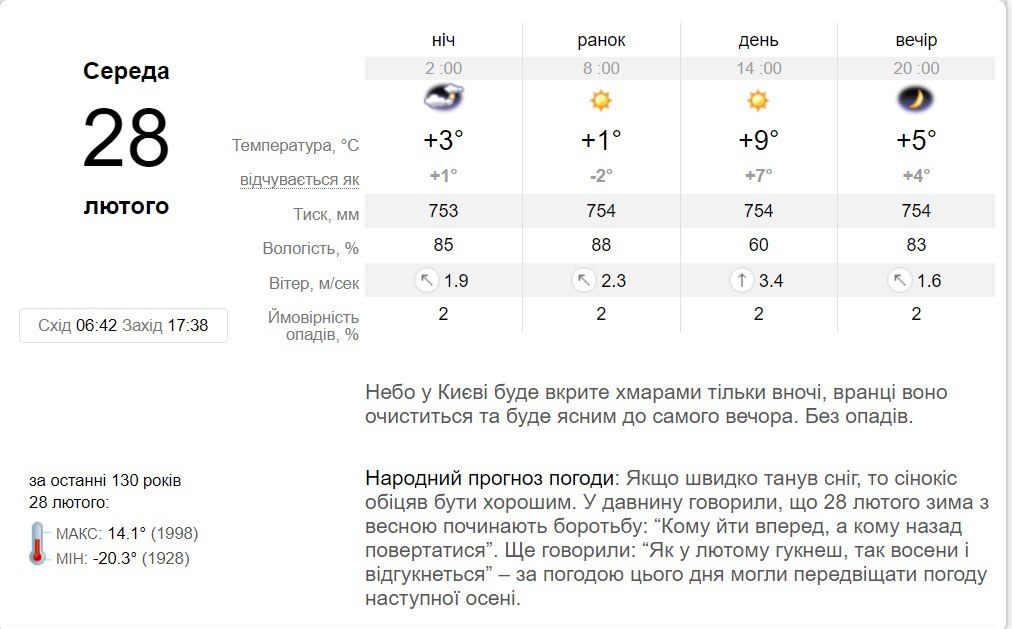 В среду, 28 февраля, от облаков, которые появятся до рассвета, уже утром не останется упоминания - до самого вечера в Киеве будет держаться ясная погода. Без осадков. Температура воздуха от +1 градуса ночью, до +9 градусов днем.