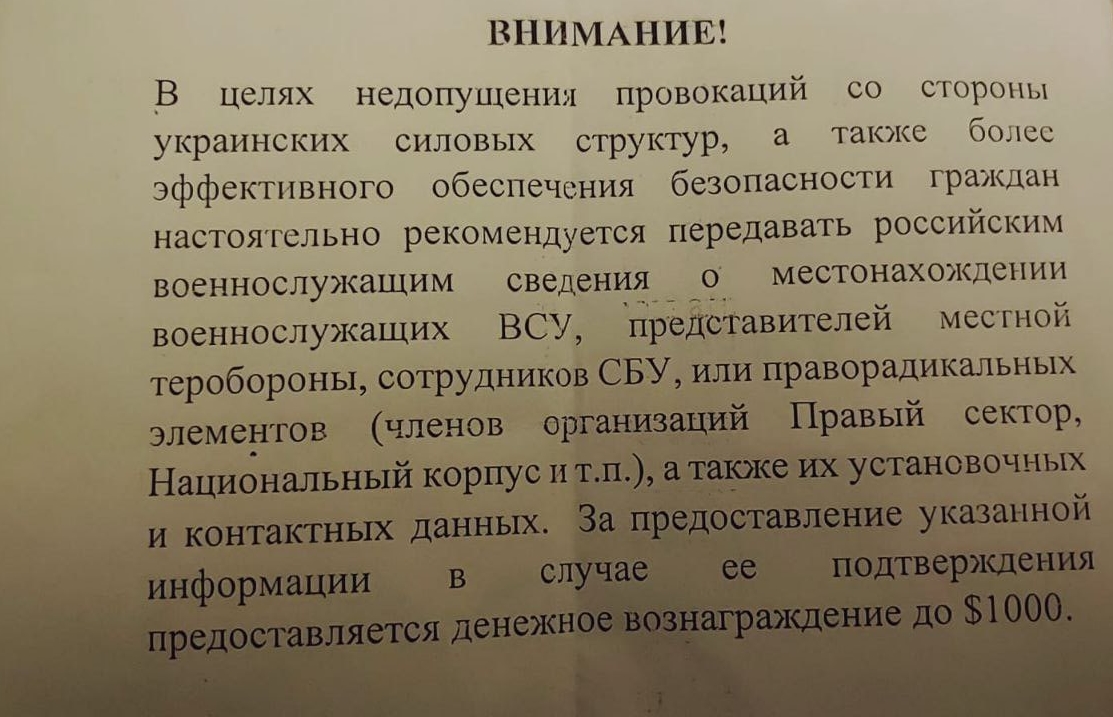Оккупанты распространяют среди местного населения листовки с "рекомендациями" передавать им сведения о месторасположении подразделений Вооруженных сил Украины, сил территориальной обороны, а также сотрудников Службы безопасности Украины.